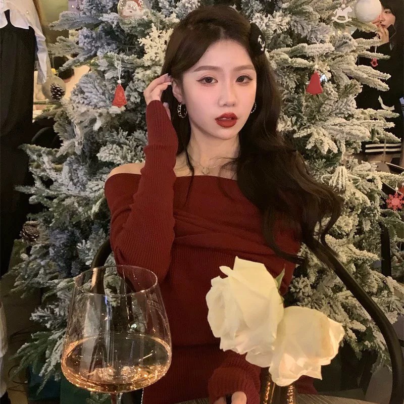 Giới thiệu Váy đầm len đỏ dáng ôm body trễ vai mặc giáng sinh tết thu đông phong cách Hàn Quốc MS6767