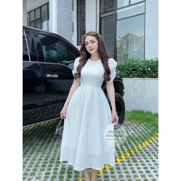 Giới thiệu Váy đầm midi dự tiệc sang trọng xoè tay nhún bồng chất xốp thêu ô vuông màu trắng đen xanh V281 full size AĐ BOUTIQUE
