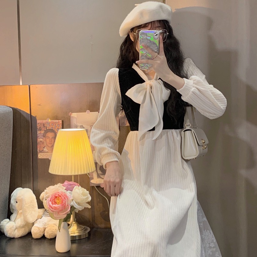 Giới thiệu Váy đầm nhung tăm corduroy trắng thắt nơ dài qua gối thu đông phong cách Hàn Quốc