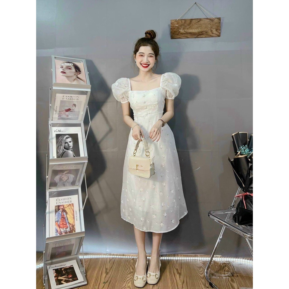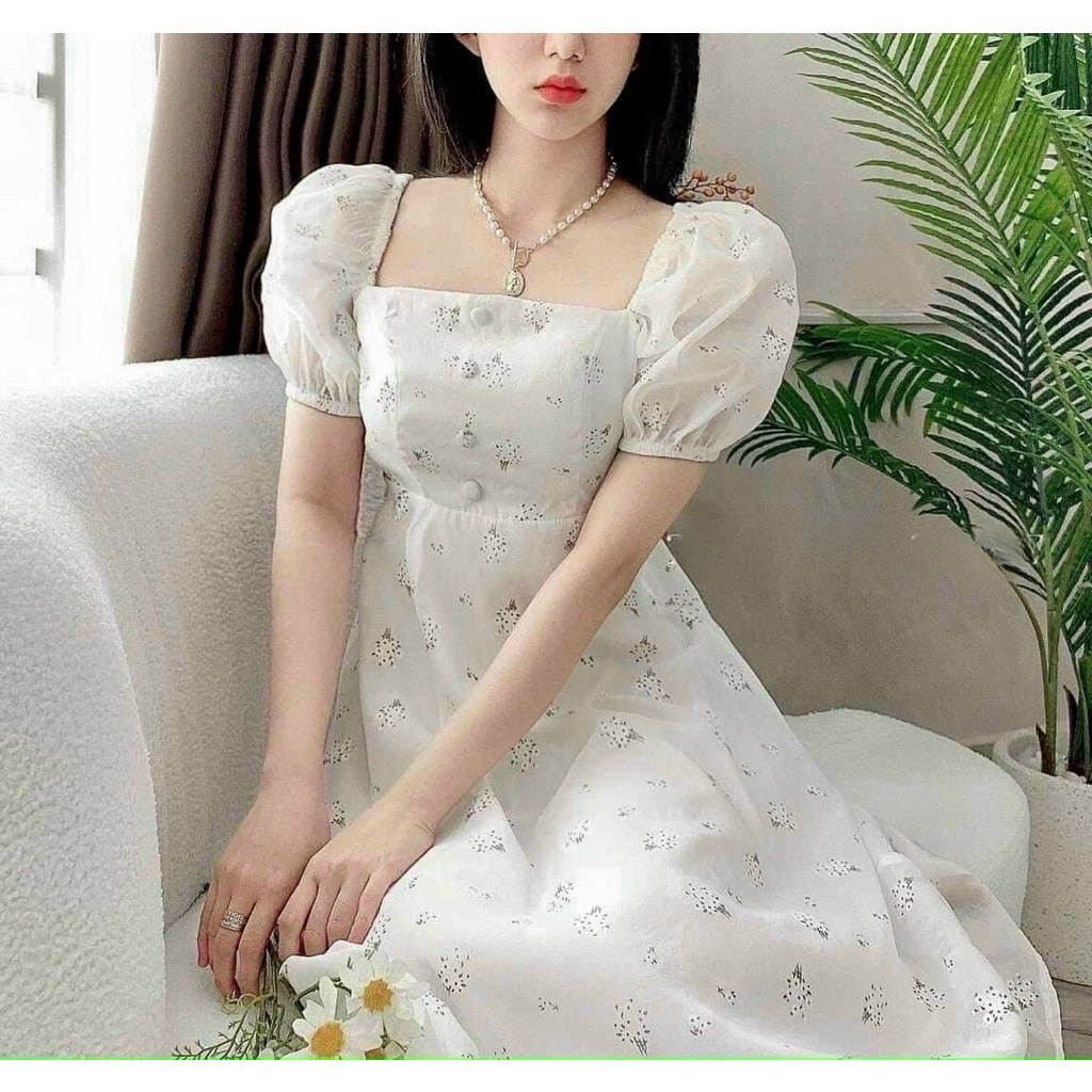 Giới thiệu Váy đầm nữ dự tiệc dáng xòe tay phồng cổ vuông họa tiết