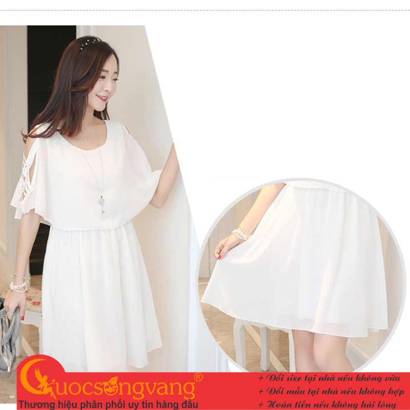 Giới thiệu Váy đầm voan hở vai ngắn tay hai lớp ngang gối kiểu Hàn Quốc GLV001 Cuocsongvang