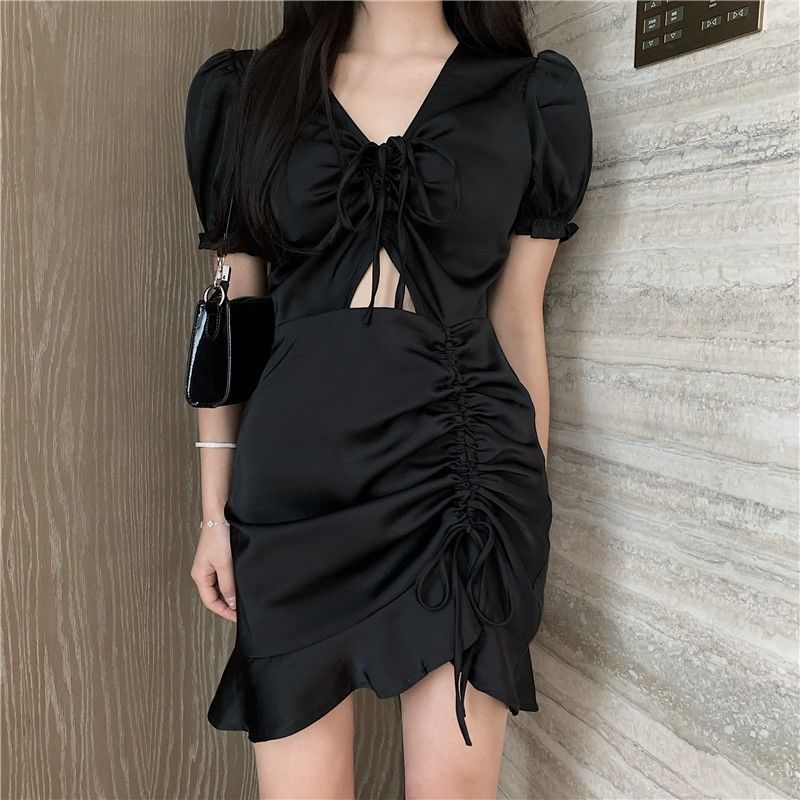 Phong cách: Khí chất / mát mẻ Các yếu tố / hàng thủ công phổ biến: Xếp nếp, ren, khoét lỗ Phong cách: Váy ngang hông Chiều dài tay váy: Tay ngắn Chiều dài váy: Váy ngắn Kiểu cổ váy: Cổ chữ V Vải / Chất liệu: Sợi hóa học / Polyester Hàm lượng thành phần: 71% -80%