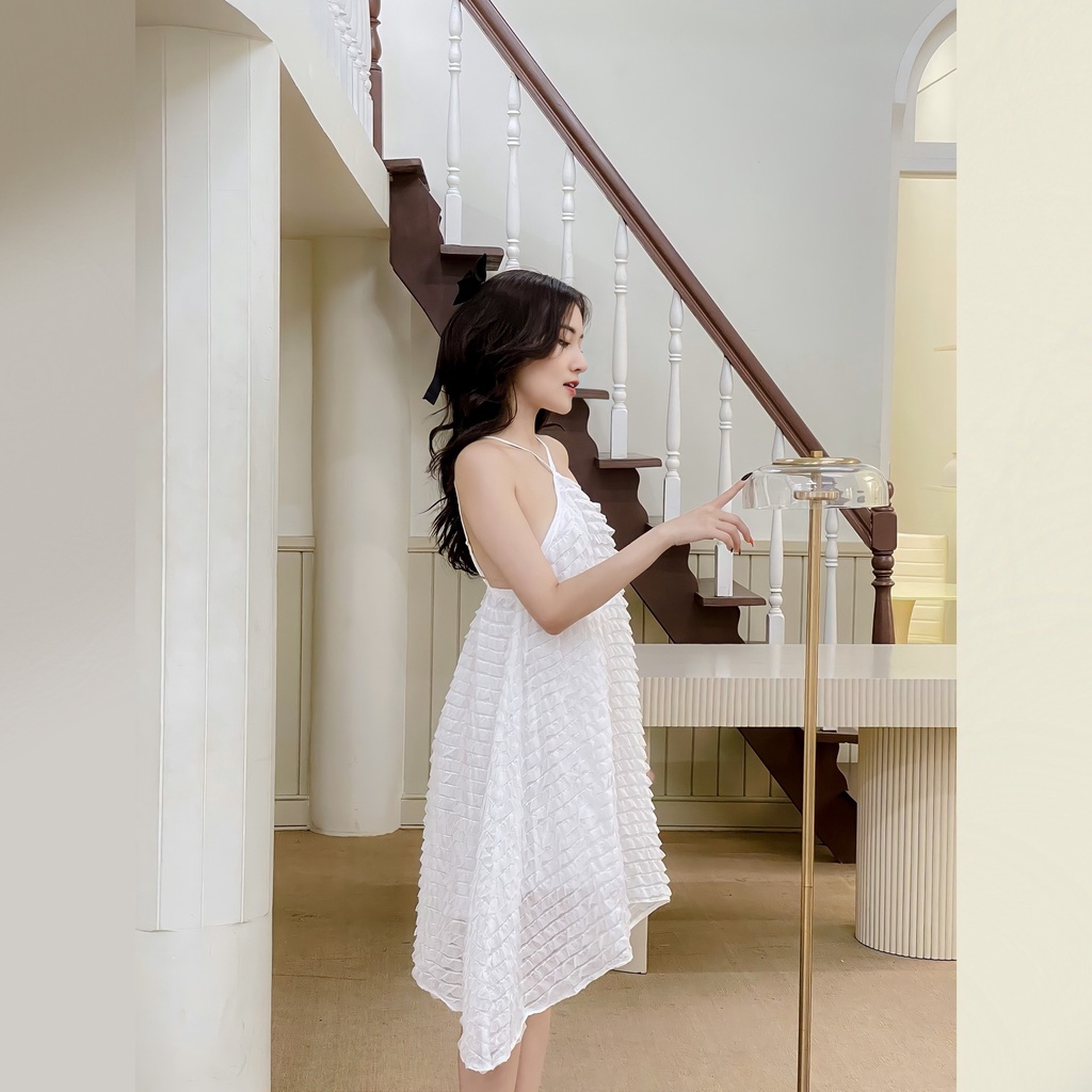 Giới thiệu Váy hai dây nữ cổ yếm Linly Store dáng xòe chất von họa tiết V-VHD3