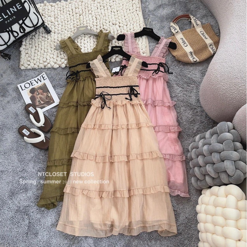 Giới thiệu Váy Hai Dây Phối Cánh Tiên Bo Chun Ngực Nhún Tầng Thắt Nơ Chất Đũi Tơ Hàng Hai Lớp