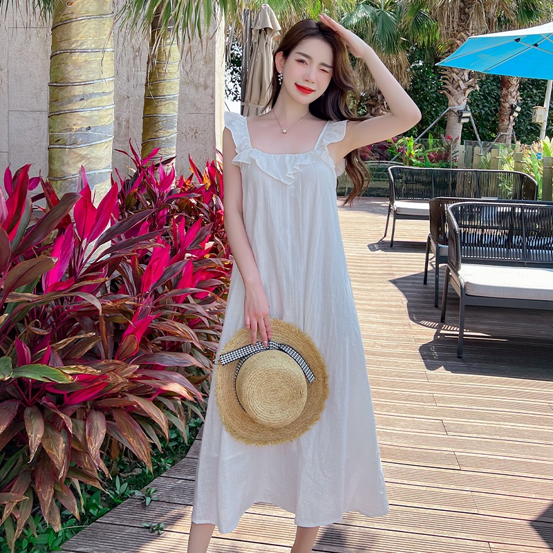 Giới thiệu Váy LUHAZO trắng đi biển đẹp trễ vai maxi 2 dây dài rộng bigsize vintage babydoll hở lưng 1092 DK14T301