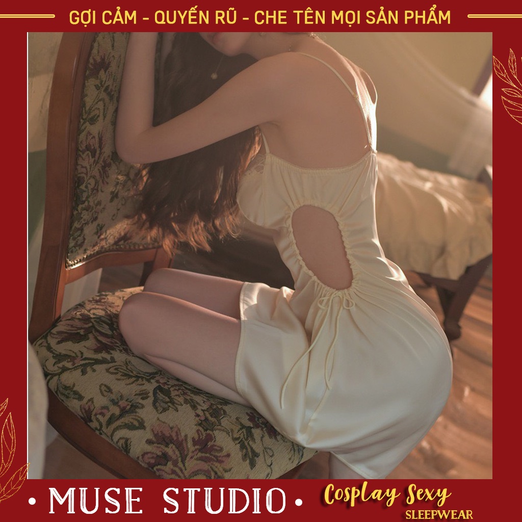 Váy ngủ sexy, đầm ngủ hai dây khoét eo rút dây tôn vòng 2 quyến rũ, vải satin cao cấp