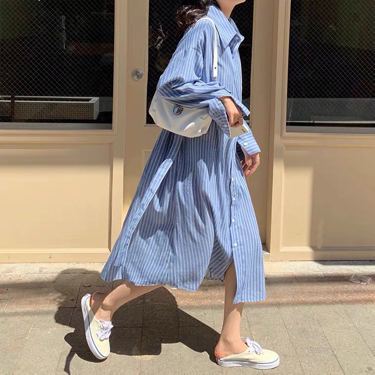 Giới thiệu Váy Sơ Mi Kẻ Sọc Dáng Suông Kèm Đai (Ảnh thật)