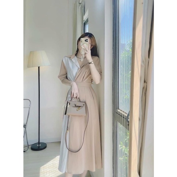 Giới thiệu Váy thiết kế phối hai màu đai eo tay bồng dáng dài tiểu thư tôn dáng