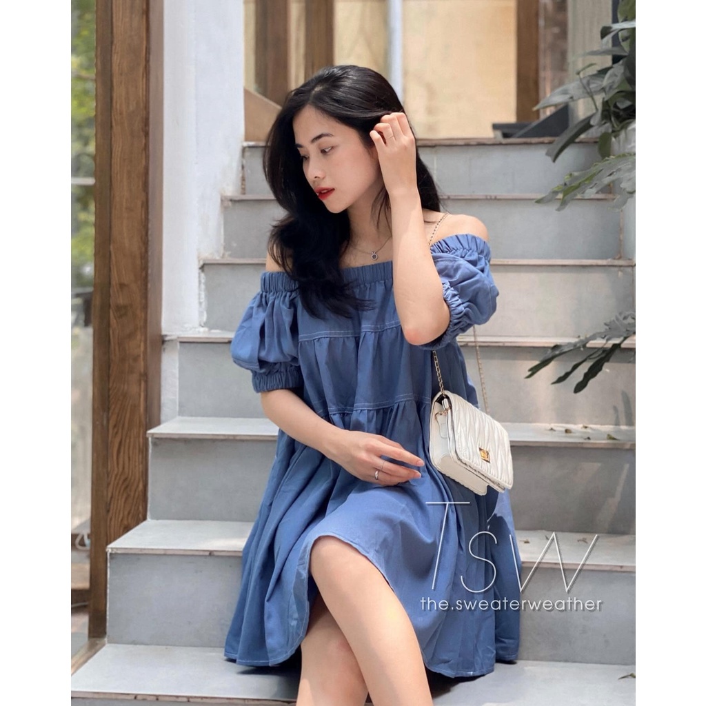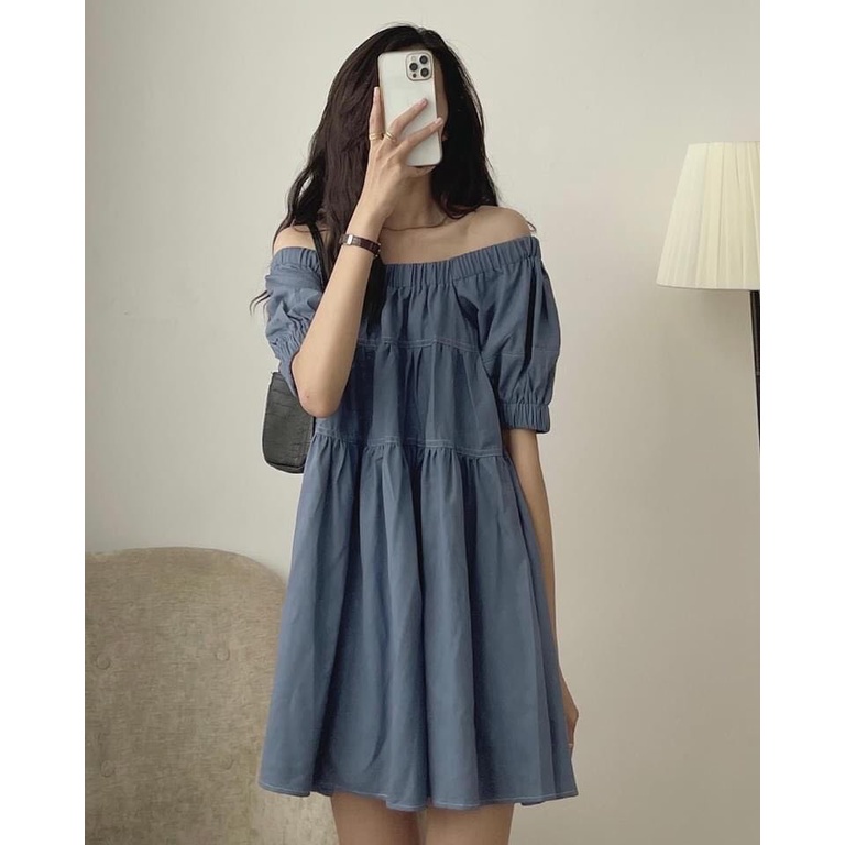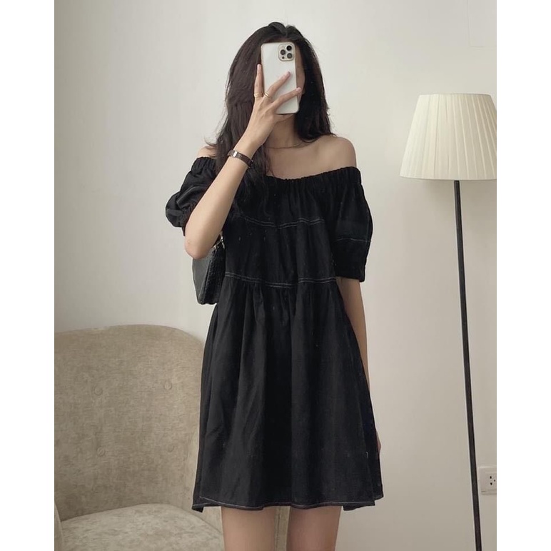 Giới thiệu Váy Trễ Vai Chỉ Nổi 3 Màu - Đầm Nữ Trễ Vai Tay Bồng Cổ Vuông Mặc 2 Kiểu Xanh Trắng Đen