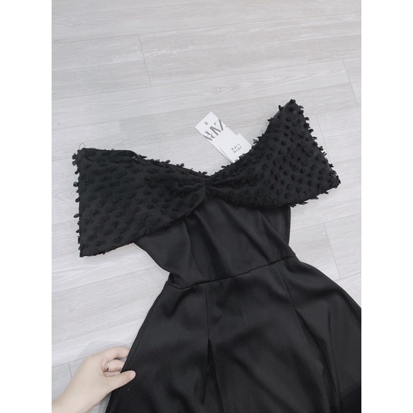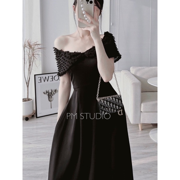 Giới thiệu Váy trễ vai đen phối voan tơ mềm xoè tiểu thư chanh xả