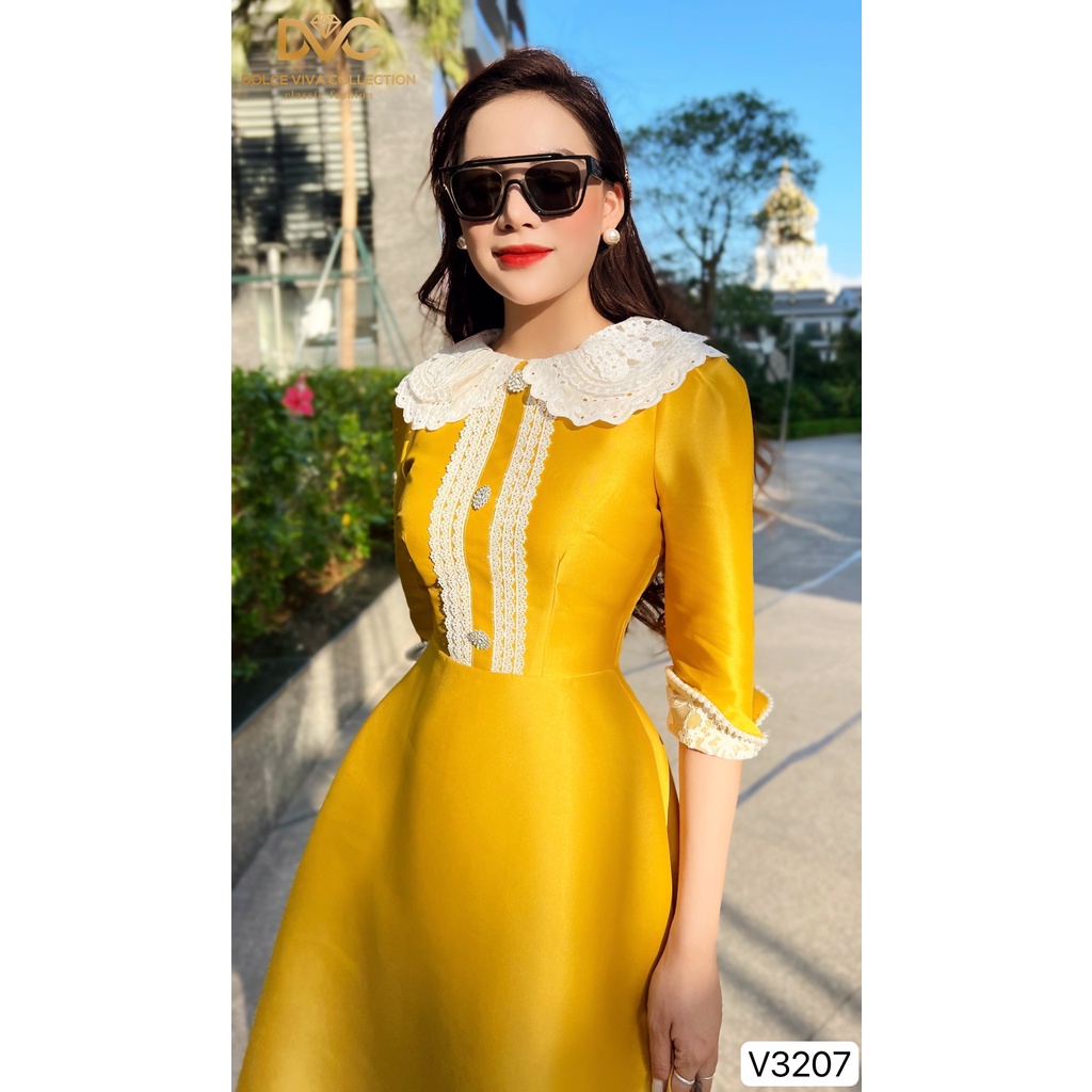 Giới thiệu VÁY VÀNG PHỐI REN BÈO CỔ TRẮNG V3207-DVC