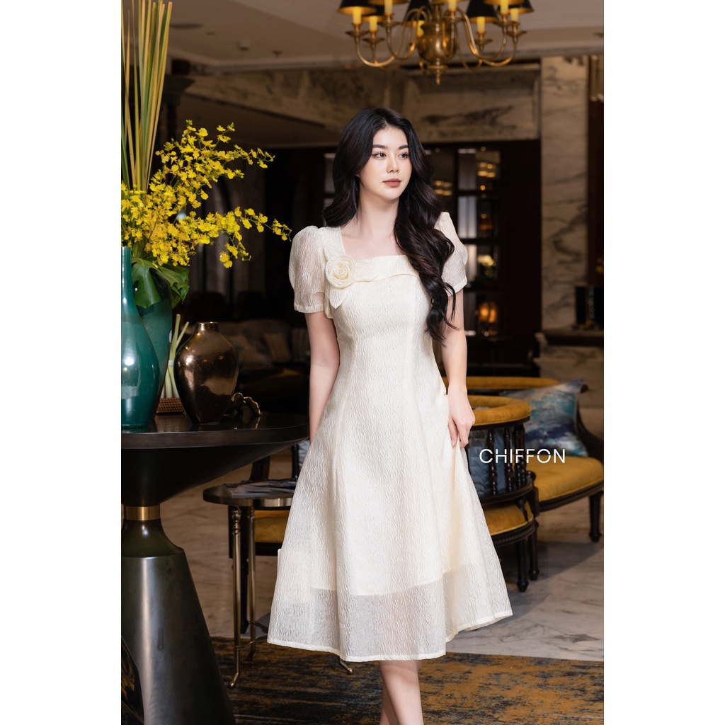 Váy xòe nữ cổ vuông cài hoa thiết kế Chiffon
