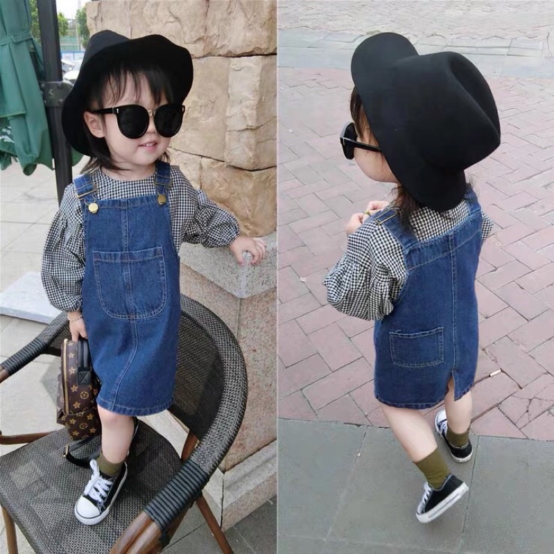 Giới thiệu Váy yếm jeans hai dây cho bé gái dáng suông dài màu xanh phối túi trước và sau yếm xinh xắn