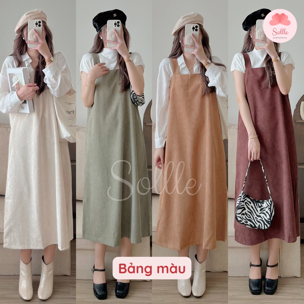 Giới thiệu Váy yếm nữ nhung gân tăm dáng dài form rộng ulzzang trơn nhiều màu Hàn Quốc Sollle
