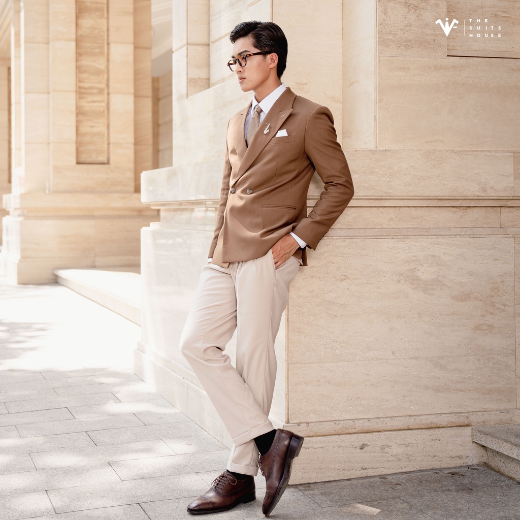 Giới thiệu Bộ vest nam nâu phối trắng kem, suits sartorial, chuẩn form The Suits House