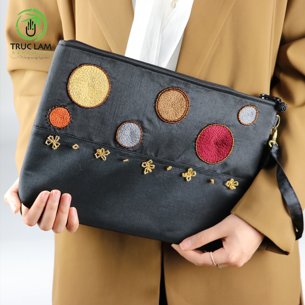 Giới thiệu Ví Cầm Tay Đựng Ipad Clutch Vải Tafta Thêu Vòng Tròn Hạt Cườm Thủ Công Cỡ Lớn - Trúc Lâm Handmade