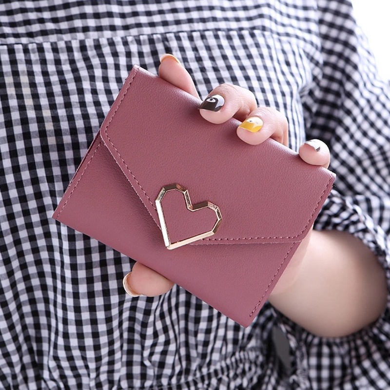 Giới thiệu Ví Ngắn Bằng Da PU Màu Trơn Đựng Thẻ / Tiền Xu Hình Trái Tim Thời Trang Hàn Quốc Cho Nữ