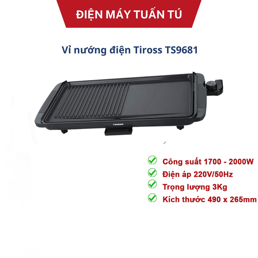 ✔ THÔNG TIN KỸ THUẬT - Thương hiệu: Tiross (Ba Lan) - Tên sản phẩm: Vỉ nướng điệnTiross TS9681 - Model: TS9681 - Xuất xứ: Trung Quốc - Công suất 1700 - 2000W - Điện áp 220V/50Hz - Dải điều chỉnh nhiệt độ 0 - 250 độ C - Chiết áp có thể tháo rời - Khay hứng mỡ thừa - Màu sắc: Đen - Kích thước 490 x 265mm - Chất liệu hợp kim nhôm - Trọng lượng 3Kg - Bảo hành 12 tháng chính hãng