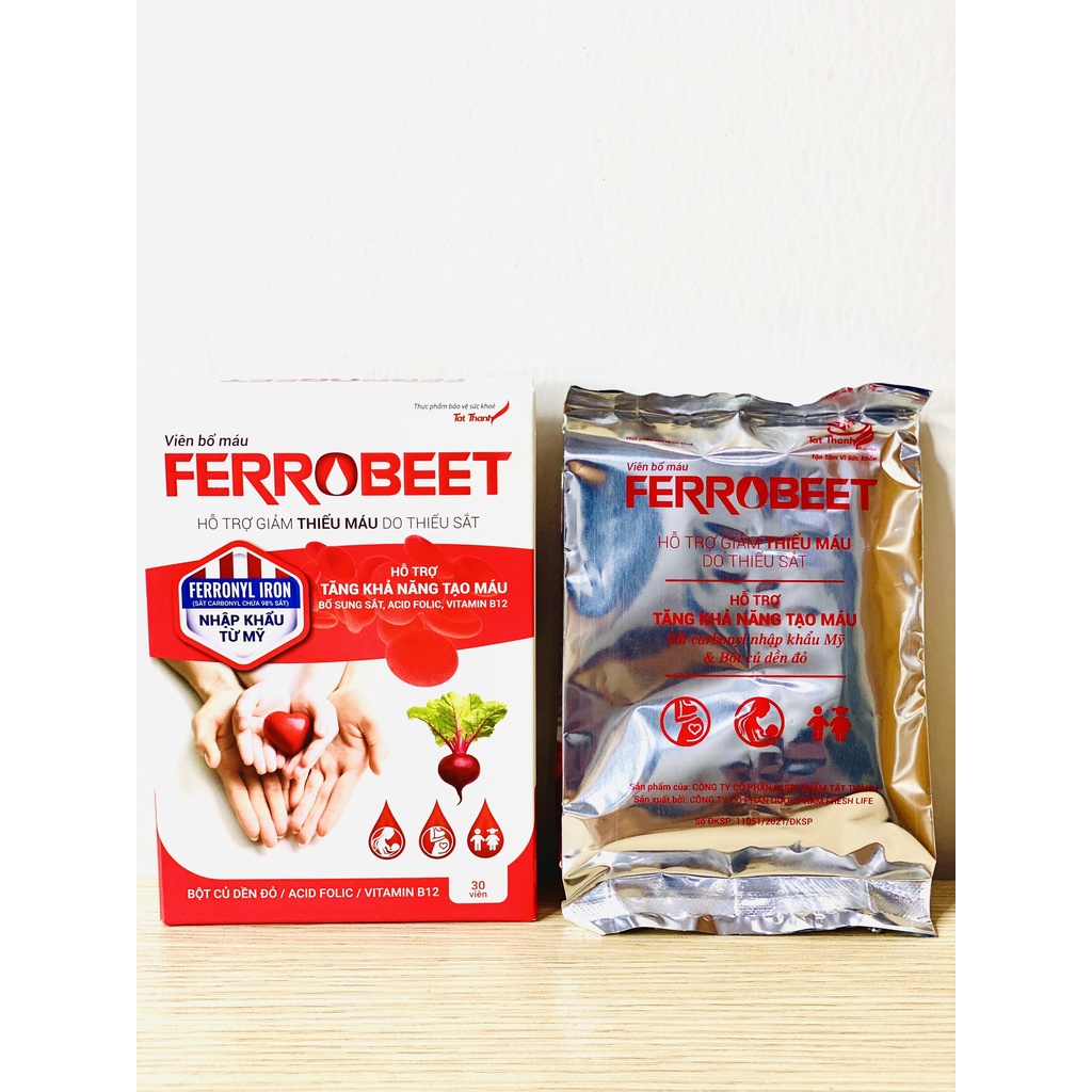 Viên bổ máu Ferrobeet Tất Thành Pharma bổ sung sắt, acid folic cho người thiếu máu Viên bổ máu Ferrobeet Tất Thành Pharma sử dụng nguyên liệu sắt carbonyl nhập khẩu từ Mỹ,nguyên liệu hàng đầu hiện nay Chứa 98% sắt nguyên tố (Fe2+),trong thành phần giúp hấp thu gần như hoàn toàn tại ruột non.Công thức bổ máu vượt trội giúp tăng khả năng tạo máu và tăng hấp thu sắ nhờ phối hợp củ dền đỏ "liều thuốc vàng" cho thai phụ, người thiếu máu, trẻ suy dinh dưỡng,người cao tuổi... 1. THÔNG TIN SẢN PHẨM VIÊN BỔ MÁU FERROBEET - Tên sản phẩm: Thực phẩm bảo vệ sức khỏe Viên bổ máu ferrobeet - Thương hiệu: Dược phẩm Tất Thành - Xuất xứ: Việt Nam - Quy cách đóng gói: 30 viên/hộp - Ngày sản xuất: Xem trên bao bì sản phẩm - Hạn sử dụng: 36 tháng kể từ ngày sản xuất - Số ĐKSP với Cục An toàn thực phẩm – Bộ Y tế: 11051/2021/ĐKSP - Công ty sản xuất: Công ty cổ phần dược phẩm Fresh Life - Địa chỉ: 1/2 lô 25 + 26+ 29 Cụm CN An Xá, phường Mỹ Xá, thành phố Nam Định, Tỉnh Nam Đinh.