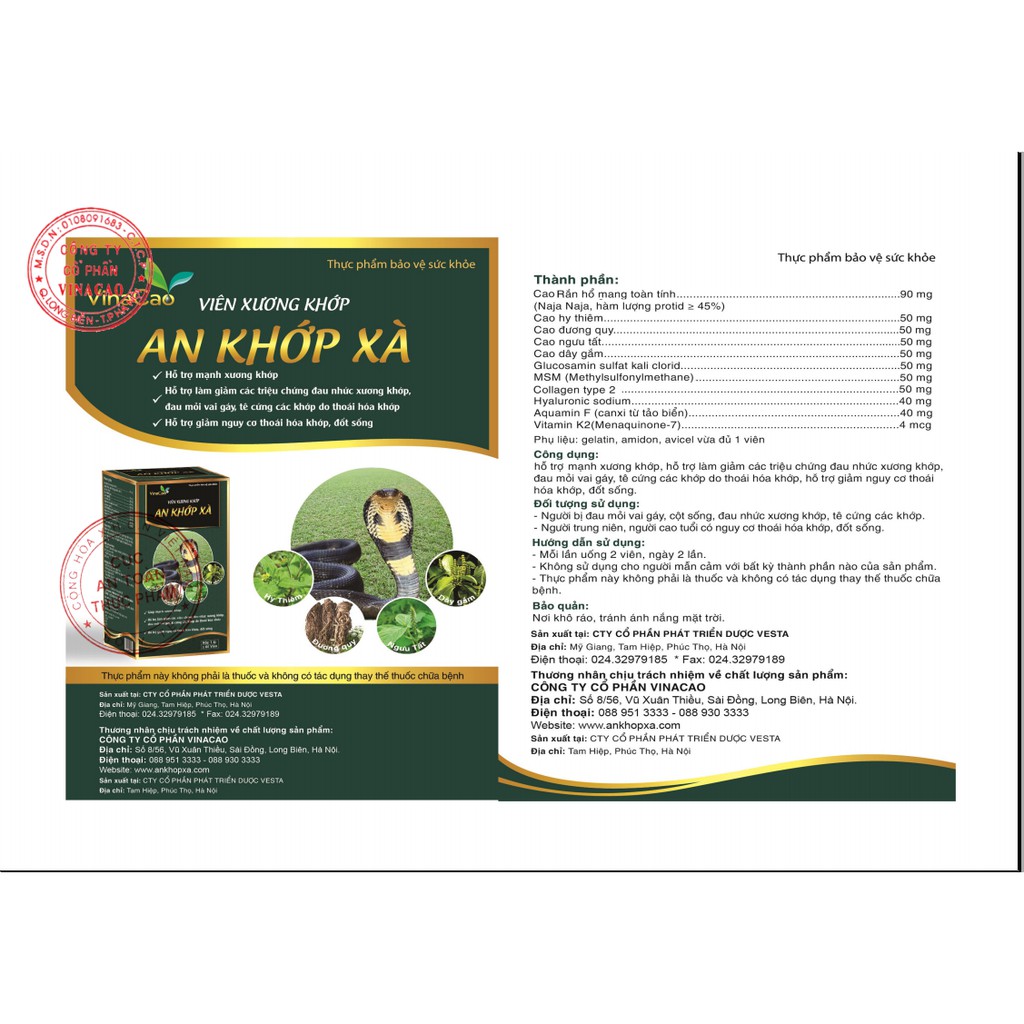1. Thành phần An khớp xà: Cao rắn hổ mang toàn tính Cao Hy thiêm Cao Ngưu tất Cao Dây gắm Cao Đương quy Glucosamin sulfat kali clorid Collagen type 2 Hyaluromic sodium Aquamin F Vitamin K2 2. Đối tượng sử dụng An khớp xà: Người bị đau mỏi vai gáy, cột sống, đau nhức xương khớp, tê cứng các khớp Người trung niên, người cao tuổi có nguy cơ thoái hóa khớp, đốt sống 3. Cách sử dụng An khớp xà: Ngày uống 2 lần, mỗi lần 2 viên 4. Công dụng sản phẩm An khớp xà: Giúp mạnh xương khớp, hỗ trợ làm giảm các triệu chứng đau nhức xương khớp, đau mỏi vai gáy, tê cứng các khớp do thoái hóa khớp Hỗ trợ làm giảm nguy cơ thoái hóa khớp, đốt sống 5. Tiêu chuẩn: TCCS 6. Bảo quản: Nơi khô ráo, thoáng mát, tránh ánh nắng trực tiếp 7. Nhà sản xuất: Công ty Cổ phần Dược Vinacao HOTLINE: 088.951.3333/ 088.930.3333 Sản phẩm này không phải là thuốc và không có tác dụng thay thế thuốc chữa bệnh. --------------------------------------------- THẢO DƯỢC VINACAO CAM KẾT CUNG CẤP SẢN PHẨM CHÍNH HÃNG 100% - NÓI KHÔNG VỚI HÀNG GIẢ, HÀNG NHÁI, HÀNG KÉM CHẤT LƯỢNG
