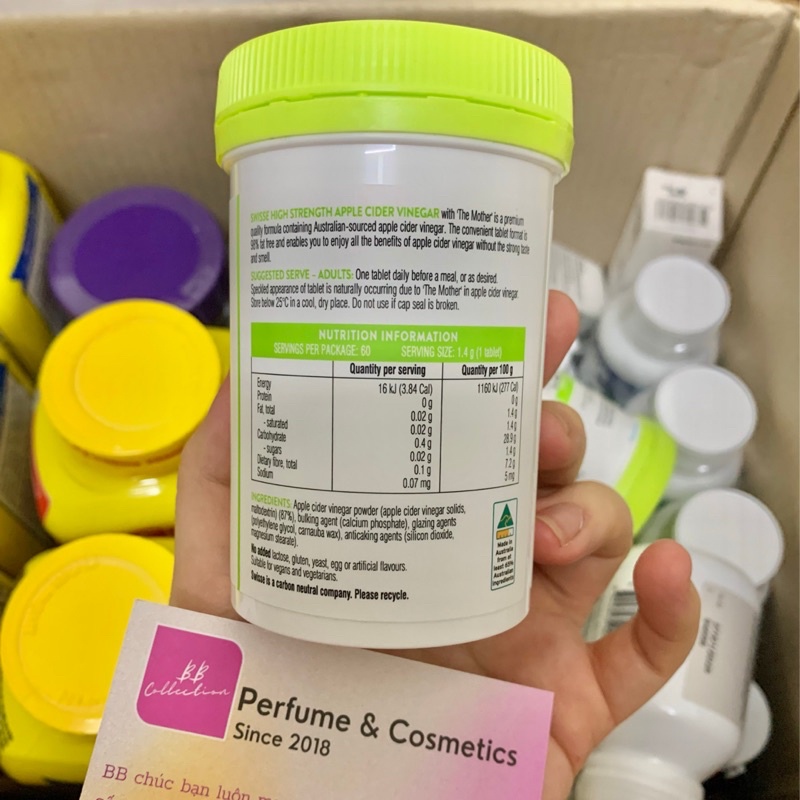 -Xuất Xứ : Úc . -Hộp 60 viên. - Công dụng của Viên giảm cân Apple Cider Vinegar: + Đốt cháy mỡ thừa nhanh chóng và hiệu quả cho vóc dáng thon gọn, cân đối và hoàn hảo. + Phòng ngừa cho những người béo phì, thừa cân hiệu quả. + Tăng cường quá trình chuyển hóa và trao đổi chất trong cơ thể diễn ra thuận lợi hơn. + Điều hòa đường huyết và làm giảm hàm lượng cholesterol. + Kiểm soát các lượng mỡ tích tụ dưới da hiệu quả. + Đối tượng sử dụng Viên giảm cân Apple Cider Vinegar: 12 tuổi trở lên - Cách dùng Viên giảm cân Apple Cider Vinegar: - 1 viên/ngày sau bữa ăn. Lưu ý : uống nhiều nước lọc...