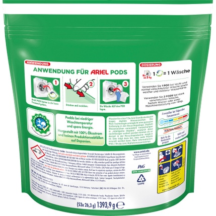 - Sức mạnh làm sạch đáng kinh ngạc chỉ trong một POD nhỏ, đánh bay kể cả những vết bẩn khó nhằn nhất - Làm mới và bảo vệ làm cho quần áo giữ màu và bền lâu hơn,xả mềm vải và lưu hương thơm mát cả ngày. - Đạt hiệu quả cao nhất ở nhiệt độ 30 ° C - Hộp được chia thành từng viên nhỏ rất thuận tiện, thay bằng việc bạn phải đổ, đong, đếm nước giặt, nước xả và vệ sinh máy giặt định kỳ thì nay chỉ cần 1 bước đơn giản gọn nhẹ thế là xong xuôi, tinh tươm. - Viên giặt là tổng hợp của 3 sản phẩm nên không cần sử dụng thêm gì khác, rất tiết kiệm cho người tiêu dùng - Nhờ đặc tính kháng khuẩn của sản phẩm nên vào những ngày thời tiết xấu quần áo không bị ẩm mốc và gây mùi khó chịu. ----------------------------------------------------------------------- CÁCH SỬ DỤNG Viên Giặt Quần Áo Tổng Hợp Ariel All in 1 Gói 53 Viên: