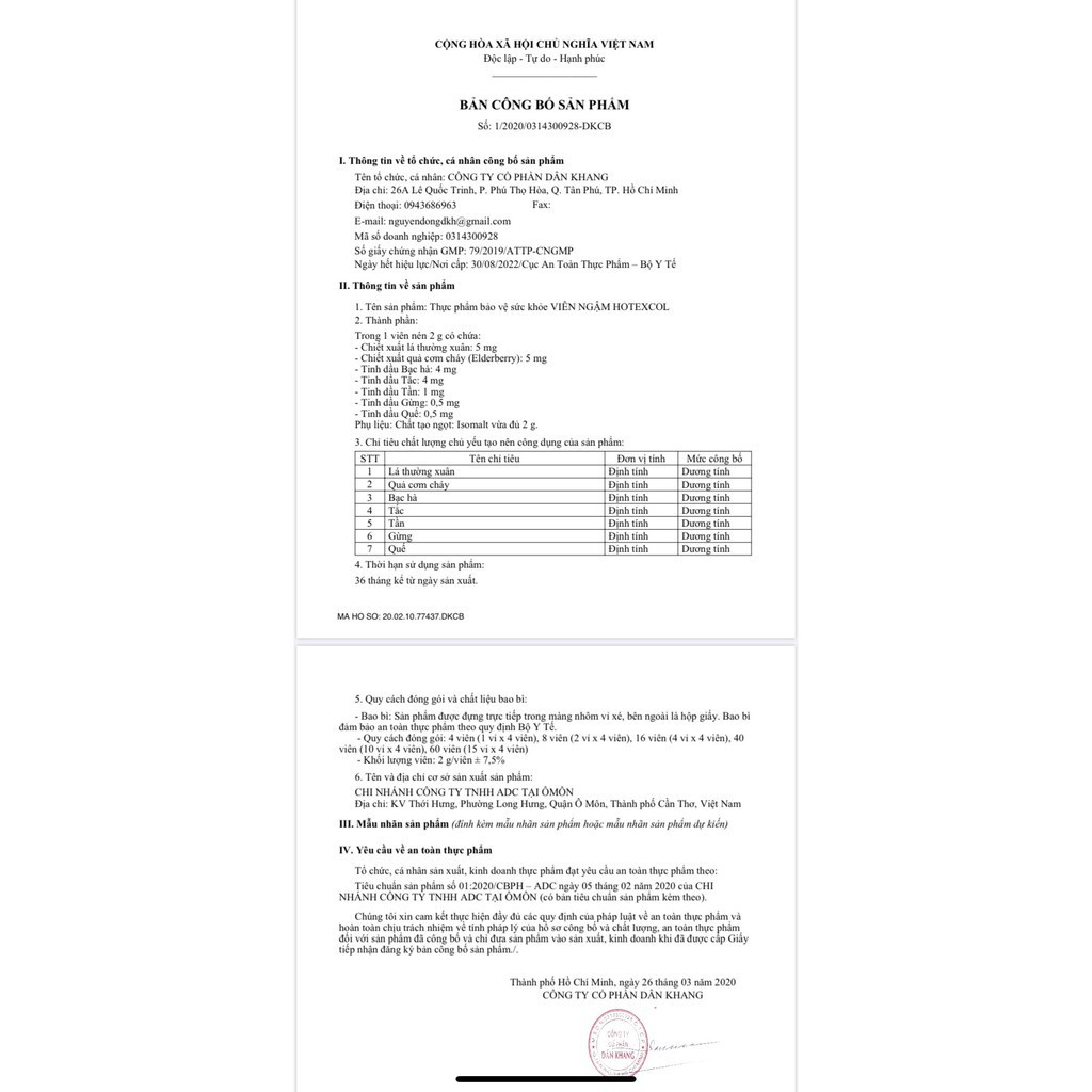 · Thông tin mô tả sản phẩm là hoàn toàn chính xác với công bố sản phẩm đã đăng ký với Bộ Y tế, 100% sản phẩm đều có giấy phép lưu hành từ Bộ y tế · Cam kết tất cả các sản phẩm cung cấp cho Quý khách hàng đều mới 100%, có nhãn hiệu và xuất xứ rõ ràng. _x000D_ +Thành phần Viên ngậm Hotexcol là sự kết hợp của 2 thành phần đặc biệt, đi đầu thị trường trong lĩnh vực kẹo ngậm ho là Chiết xuất lá Thường xuân và Chiết xuất Quả Cơm cháy (Elderberry) cùng 5 loại tinh dầu: tinh dầu Bạc Hà, tinh dầu Tắc, tinh dầu Tần, tinh dầu Gừng, tinh dầu Quế giúp thông họng, giảm ho, giảm tiết đờm dãi, giảm đau rát họng do ho kéo dài.