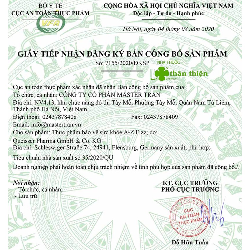 Hộp 1 tuýp x 13 viên sủi, sử dụng được khoảng 13 ngày. Chất liệu bao bì: Sản phẩm được đóng trong tuýp nhựa đảm bảo đủ điều kiện vệ sinh an toàn thực phẩm theo quy định của Bộ Y Tế. Sản phẩm này không phải là thuốc và không có tác dụng thay thế thuốc chữa bệnh Khối lượng viên: 6200 mg/ viên ± 7.5% Khối lượng tịnh: 80.6g. Dạng bào chế: Viên sủi màu trắng vàng Giấy phép xác nhận từ Bộ Y Tế Sản phẩm này không phải là thuốc và không có tác dụng thay thế thuốc chữa bệnh Số giấy tiếp nhận đăng ký bản công bố sản phẩm: 7155/2020/ĐKSP cấp ngày 04 tháng 08 năm 2020. Số bản công bố: 7/2020/0105381169-DKCB. Số giấy xác nhận nội dung quảng cáo: 2891/2020/XNQC-ATTP cấp ngày 14 tháng 09 năm 2020 Đơn vị sản xuất và thương mại Sản xuất tại: Queisser Pharma GmbH & Co.KG Chịu trách nhiệm nhập khẩu và phân phối bởi: Công ty cổ phần Master Tran