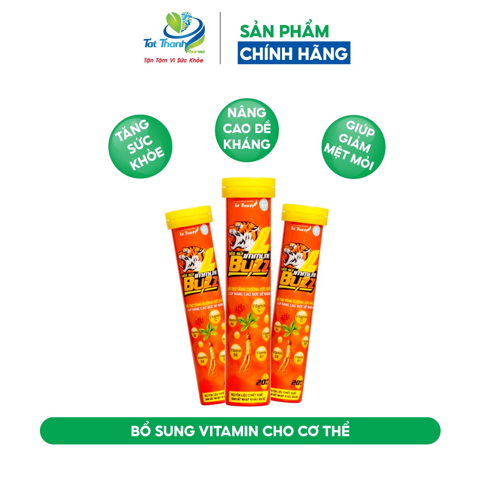 1. THÔNG TIN SẢN PHẨM VIÊN SỦI IMMUNE BUZZ VỊ CAM - Tên sản phẩm: Thực phẩm bảo vệ sức khỏe Viên sủi Immune Buzz vị cam - Thương hiệu: Dược phẩm Tất Thành - Xuất xứ: Việt Nam - Quy cách đóng gói: Lốc 12 tuýp x 20 viên sủi/tuýp - Ngày sản xuất: Xem trên bao bì sản phẩm - Hạn sử dụng: 36 tháng kể từ ngày sản xuất - Công ty sản xuất: Công ty Cổ phần Dược phẩm Fresh Life. - Địa chỉ: ½ lô 25+26+29 Cụm CN An Xá, Phường Mỹ Xá, Thành phố Nam Định, Tỉnh Nam Định