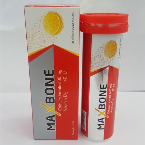 Thành phần Viên sủi Maxbone: • Calci lactate………………………………600 mg • Vitamin D3………………………………..40 IU • Calci carbonate Nano………….200 mg Phụ liệu: Calci carbonat 200mg, Natri bicarbonat, acid citric, sucroza, Aspartam, natri sacarin, chất tạo màu beta carotene, hương vị cam, natri laurylsulphat, natribenzoat, polyethylene glycol 6000, màu Sunset Yellow vừa đủ 1 viên