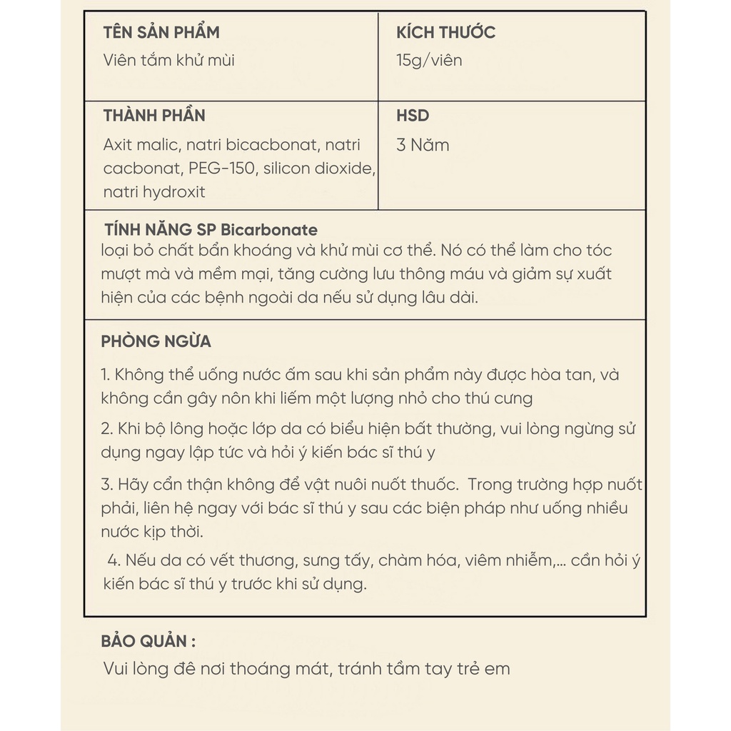 CHI TIẾT SẢN PHẨM - Thương hiệu: FORSURE - Sản phẩm: Viên tắm sủi bọt khử mùi lông - Màu sắc: trắng - Khối lượng: 15G/v - Thành phần : Axit malic, natri bicacbonat, natri cacbonat, PEG-150, silicon dioxide, natri hydroxit - Xuất xứ: china