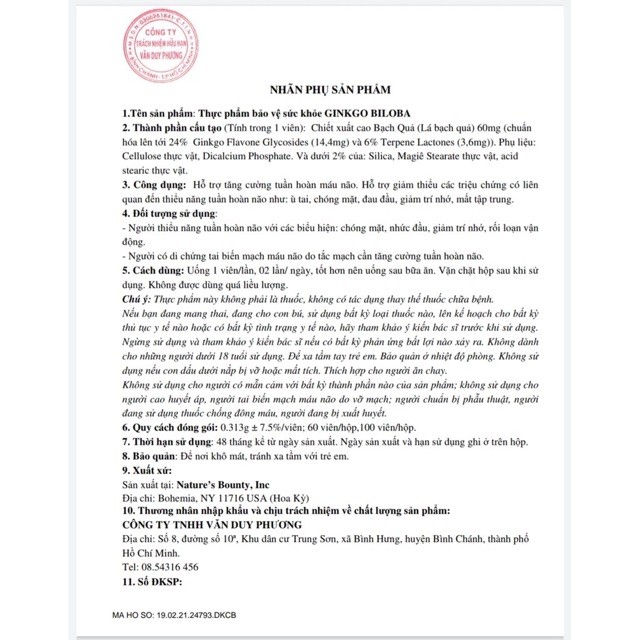 Thành phần: - Chiết xuất lá Ginkgo biloba 60 mg (tiêu chuẩn hóa chứa to 24% Ginkgo Flavone Glycosides, đạt 14.4 mg và 6% Terpene Lactones [3.6 mg]) - Các thành phần khác: bột gạo, Gelatin, Vegetable Magnesium Stearate