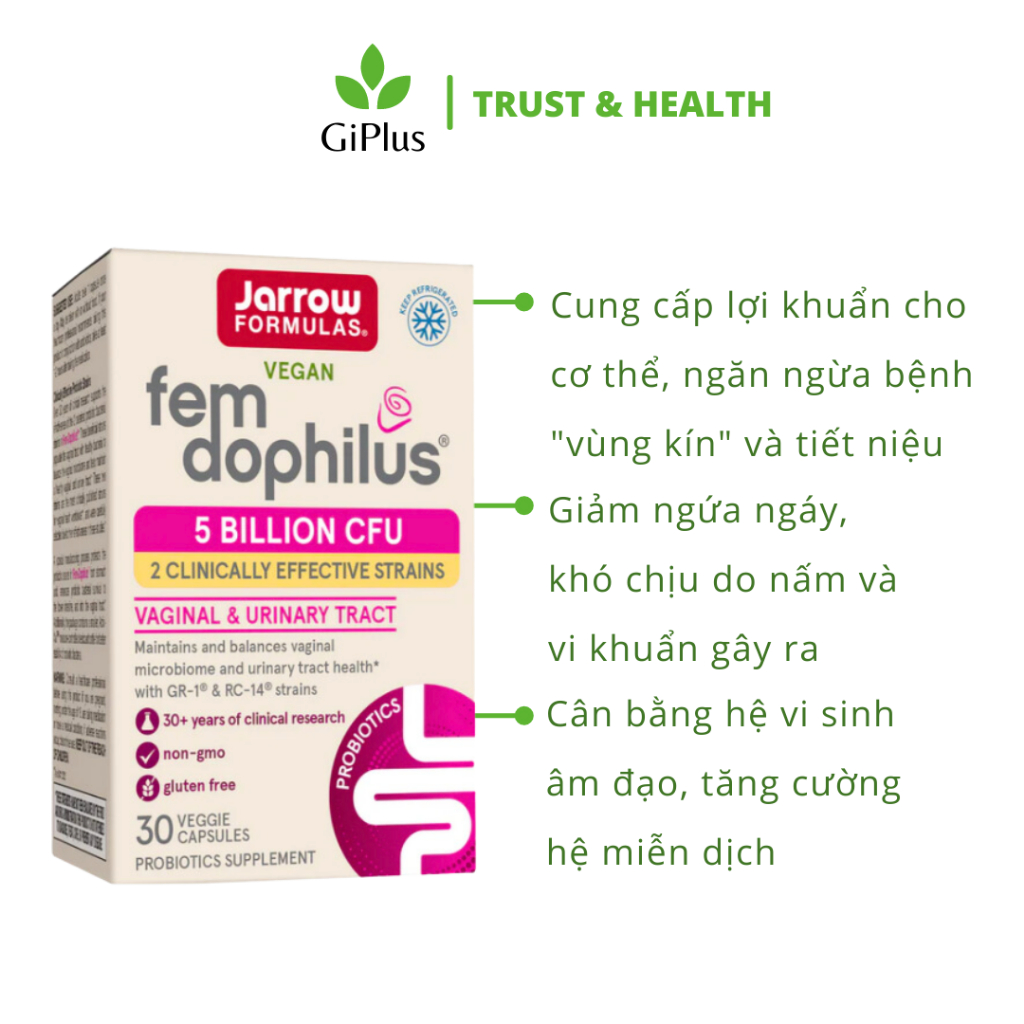 Sản phẩm sẽ cung cấp 5 tỷ lợi khuẩn cần thiết cho cơ để đặc biệt ở khu vực “vùng kín” của phụ nữ. Hỗ trợ tăng cường sản sinh vi khuẩn có lợi, giúp cân bằng hệ vi khuẩn, duy trì sức khỏe vùng kín và đường tiết niệu khỏe mạnh. Từ đó, giúp “cô bé” giảm các triệu chứng ngứa ngáy, khó chịu do vi khuẩn, nấm gây ra. _____________________________________ 1. Thông tin sản phẩm: Thành phần: Proprietary Probiotic Blend 134mg, - Lactobacillus rhamnosus, GR-1 - Limo Lactobacillus reuteri, RC-14 Quy cách đóng gói: Lọ 30 viên Xuất xứ: Mỹ Thương hiệu: Jarrow Formulas Hạn sử dụng (Exp): Xem trên bao bì sản phẩm