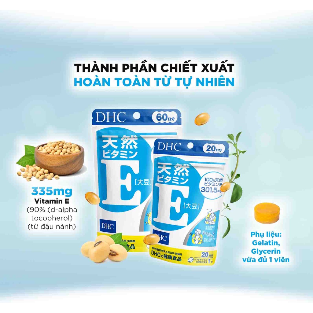 THÀNH PHẦN VIÊN UỐNG BỔ SUNG VITAMIN E DHC - Thành phần chính của viên uống bao gồm: vitamin E tự nhiên chiết xuất từ đậu nành, gelatin, glycerin. - Viên uống vitamin E DHC có chứa 301.5 mg d-a tocopherol tự nhiên, là dạng vitamin E có hiệu quả tối ưu nhất và được khuyến nghị dùng mỗi ngày.