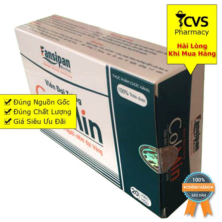 QUY CÁCH: Hộp 20 viên Mô tả Viên Đại Tràng ColMin là Sản phẩm dành cho người Viêm Đại Tràng, Đại Tràng co thắt, rối lọa tiêu hóa Viên Đại tràng Colmin với thành phần chính là Cao Nhũ Hương, Xuyên Tâm Liên, Curcumin (củ nghệ vàng) là những loại dược liệu quý và được coi là những Kháng sinh tự nhiên giúp việc cải thiện Viêm Đại Tràng, Đại tràng co thắt và rối lạo tiêu hóa hiệu quả mà không lo tái lại.