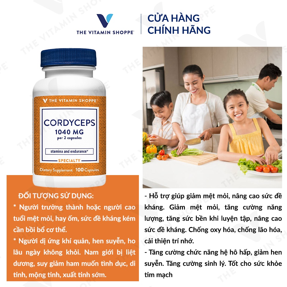 CÔNG DỤNG VIÊN UỐNG ĐÔNG TRÙNG HẠ THẢO THE VITAMIN SHOPPE - Đông trùng hạ thảo viên uống hỗ trợ giúp giảm mệt mỏi, nâng cao sức đề kháng. Giảm mệt mỏi, tăng cường năng lượng, tăng sức bền khi luyện tập, nâng cao sức đề kháng. Chống oxy hóa, chống lão hóa, cải thiện trí nhớ. - Viên uống đông trùng hạ thảo tăng cường chức năng hệ hô hấp, giảm hen suyễn. Tăng cường sinh lý. Tốt cho sức khỏe tim mạch.