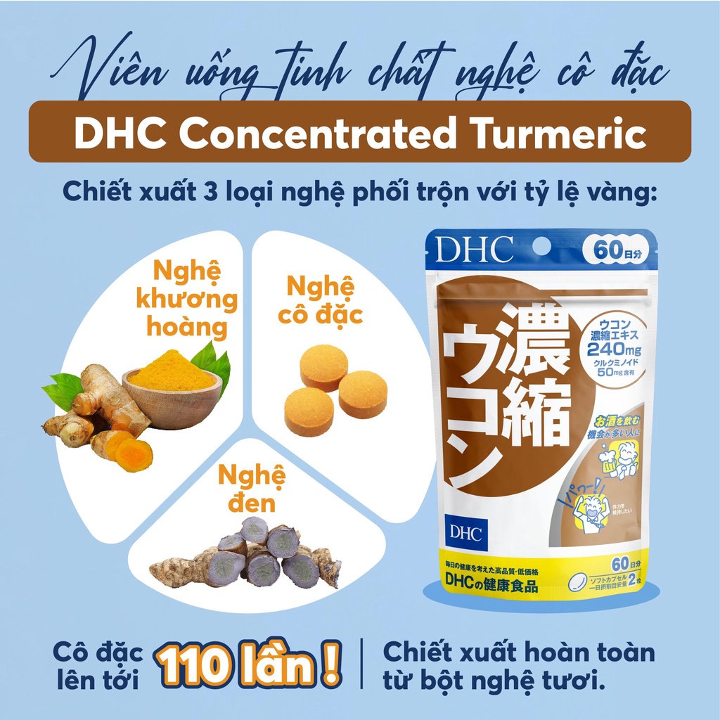 Viên Uống Giải Rượu, Thải Độc Gan, Cải Thiện Da Mụn DHC Concentrated Turmeric Thương hiệu: DHC Xuất Xư: Nhật Bản Quy Cách: Gói dùng 30 ngày (60 viên)
