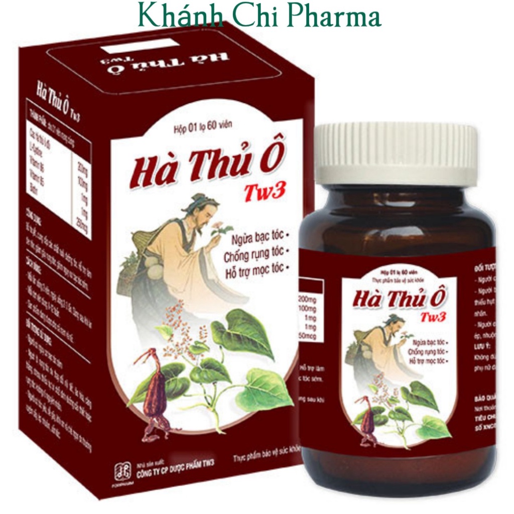 1.Thành phần viên uống hà thủ ô tw3. Chiết xuất từ Cao Hà Thủ Ô (200 mg), Biotin (250 mcg), L-Cystine (100 mg), Vitamin B5 (1 mg), Vitamin B6 (1 mg) là những dưỡng chất rất tốt cho mái tóc. 2. Công dụng hà thủ ô. Cải thiện tình trạng tóc rụng nhiều, bảo vệ tóc chắc khoẻ, bóng mượt. Ngăn ngừa tình trạng tóc bạc sớm, bạc nhiều, hiện tượng lão hoá trước tuổi do rối loạn nội tiết. Hỗ trợ chứng hói đầu (ở nam), thưa tóc (ở nữ) 3. đối tượng sử dụng, cách dùng. Người sớm bị bạc tóc, cần làm đen tóc. Người bị khô xơ và gẫy rụng tóc. Người thường xuyên tạo kiểu, sử dụng hoá chất lên tóc như: ép, nhuộm, sấy, uốn… Người bị đau các vấn đề về nội tiết tố: stress, căng thẳng, bốc hoả, lão hoá. Người bị tóc sau sinh do chân tóc yếu đi. Dùng được cho cả nam và nữ Uống mỗi lần 2 viên ngày uống từ 2 – 3 lần, sau khi ăn Nên dùng ít nhất 1 đợt ( 8 – 12 tuần) để gặt hái hiệu quả như ý nhất. * Sản phẩm không phải là thuốc, không có tác dụng thay thế thuốc chữa bệnh. TIÊU CHUẨN: 021017/TCCS - HV SỐ XNCB: 45745/2017/ATTP - XNCB Nhà sản xuất: Công ty cổ phần dược phẩm TW3 Nhà phân phối: Công ty cổ phần TM & dược phẩm Hưng Việt Địa chỉ: Số 46 lô M2 Khu đô thị mới Yên Hòa, phường Yên Hòa, quận Cầu Giấy, Hà Nội.