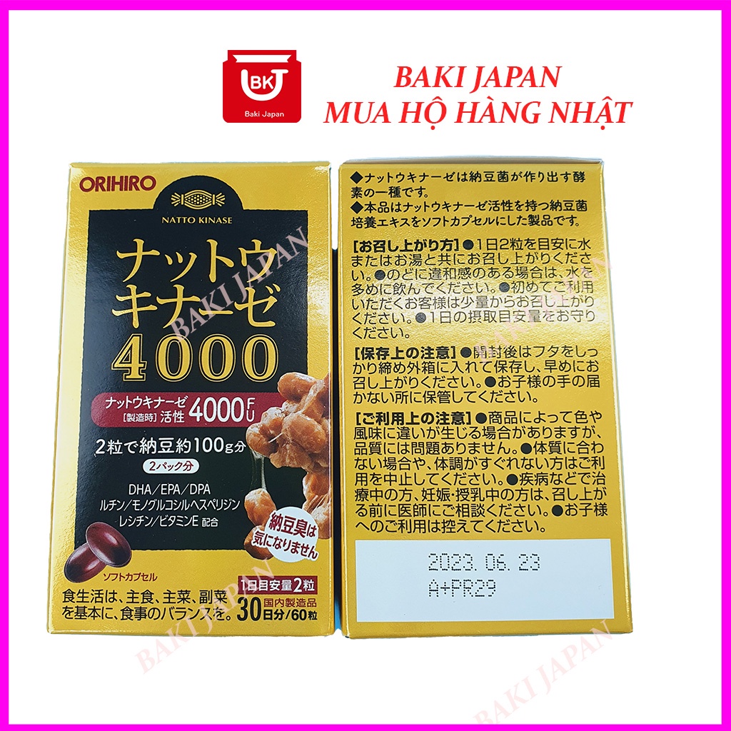 🔴 THÔNG TIN SẢN PHẨM • Xuất xứ: Nhật Bản • Quy cách: Dạng gói 60 viên 30 ngày • Mã JAN: 4571157259116 • Nhà sản xuất: Orihiro Viên uống Chống đột quỵ Orihiro 4000FU Nhật Bản là sản phẩm sử dụng nguồn nguyên liệu chính từ Natto – đậu nành lên men, với hàm lượng Nattokinase lên đến 4000FU, giúp làm tan cục máu đông, phòng ngừa và hỗ trợ hiệu quả các că.n bệ.nh nguy hiểm như đ.ột quỵ, tai bi.ến,…