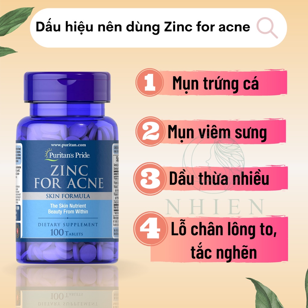 Giới thiệu Viên uống kẽm giảm mụn trứng cá, mụn viêm Zinc For Acne Puritan's Pride cho da dầu mụn 100 viên