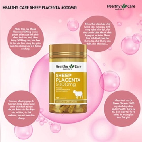 1.1. CÔNG DỤNG VIÊN UỐNG NHAU THAI CỪU HEALTHY CARE SHEEP PLACENTA 5000MG: - Làm mờ vết tàn nhang, vết nám, vết thâm. - Giữ ẩm, làm giảm nếp nhăn hiệu quả cho bạn làn da tươi trẻ đầy sức sống. - Làm tăng tính co giãn, đàn hồi cho làn da, giảm sệ ngực sau khi sinh. - Tăng cường hệ miễn dịch. - Cải thiện sức sống và sinh lực cho cơ thể. - Làm tăng sản xuất tế bào mới và giảm sự xuất hiện sẹo. - Điều hòa sự tiết chất nhờn và làm giảm sự mở lỗ chân lông. - Điều hòa chu kì kinh nguyệt, giảm các chứng thống kinh, làm giảm các triệu chứng khó chịu ở thời kỳ tiền mãn kinh. - Chống ôxy hóa, chống lão hóa. - Làm lành các vết thương, giải độc một cách tự nhiên - Tăng cường sức khỏe.