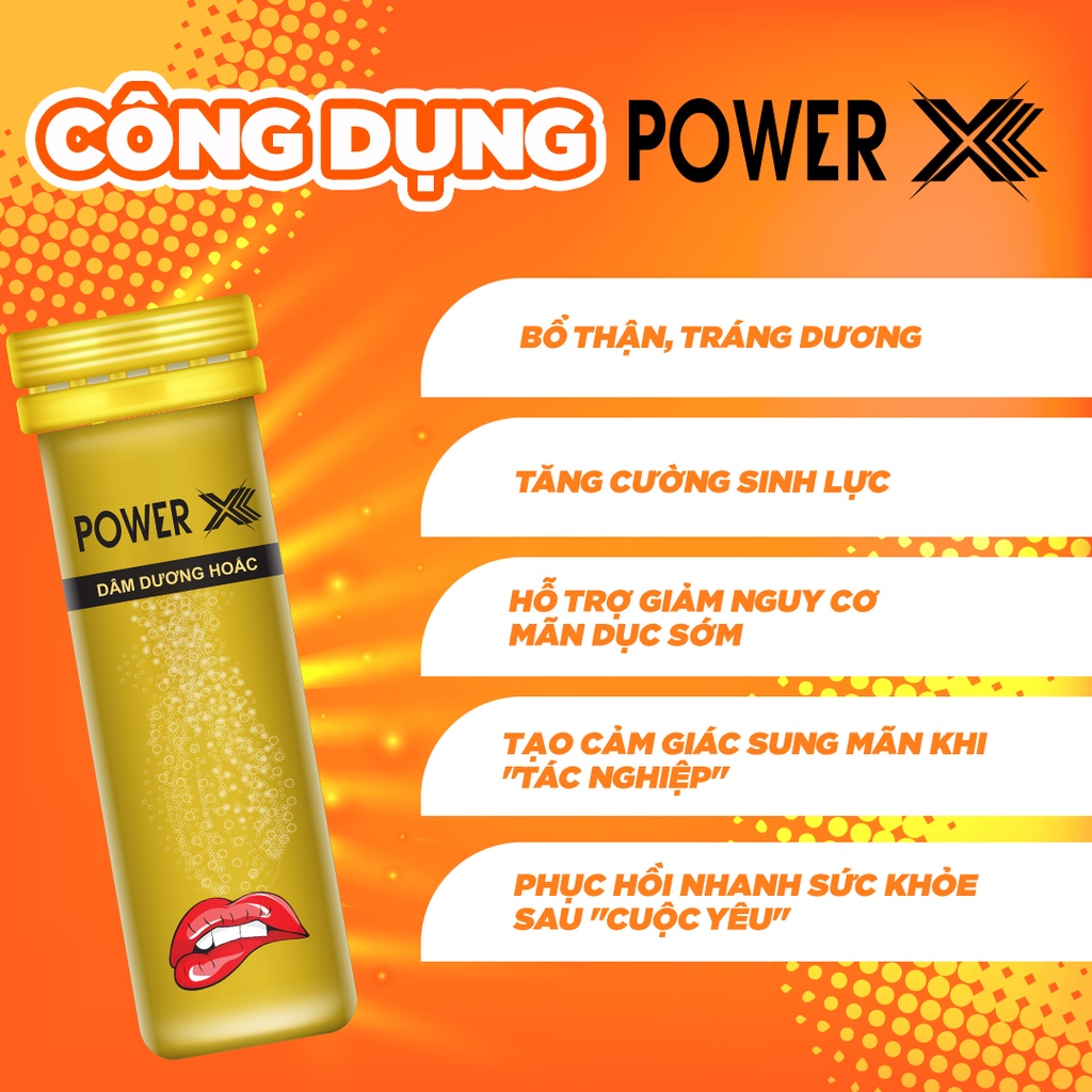 II. Công dụng của Viên sủi tăng cường sinh lý nam giới POWER X: - Bổ thận, tráng dương - Tăng cường sinh lực, sinh lý - Tăng chất lượng tinh trùng, giúp tinh trùng khoẻ mạnh và đậm đặc - Hỗ trợ giảm nguy cơ mãn dục sớm - Tạo cảm giác sung mãn khi "tác nghiệp" - Phục hồi nhanh sức khỏe sau "cuộc yêu"