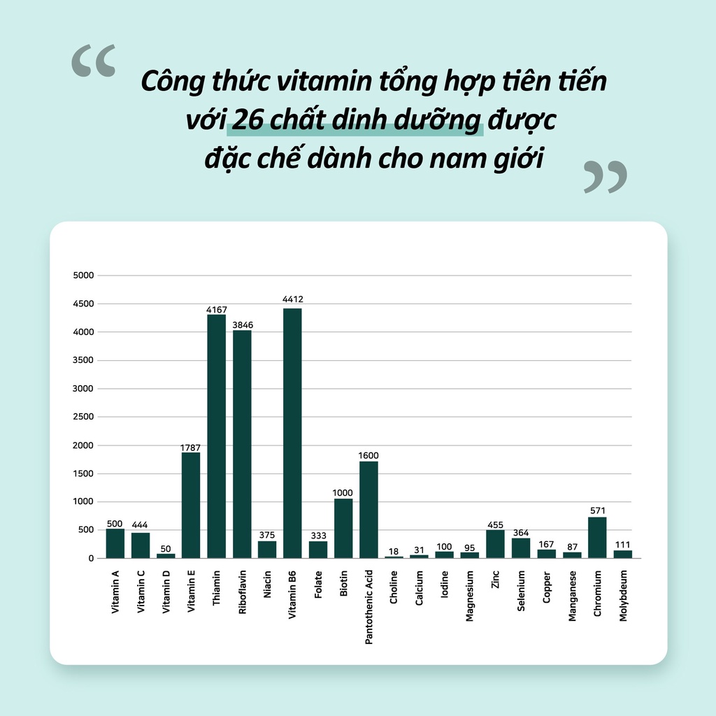 Nhiều Thành Phần, Nhiều Lợi Ích; Male Multiple chứa vitamin A, B2, B6, B12, C, D & E, niacin, biotin, choline, đồng, crom, natri, kali, canxi, iốt, magiê, kẽm, cây cọ lùn, selen, axit folic, v.v. Solgar Male Multiple thuần chay và không chứa: gluten, lúa mì, sữa, men, đường, hương vị nhân tạo và chất bảo quản