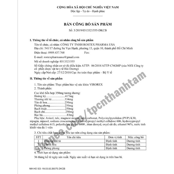 Sản xuất tại : CÔNG TY CỔ PHẦN DƯỢC VẬT TƯ Y TẾ HẢI DƯƠNG Đ/c:Số 102 ,Phố Chi Lăng , Phường Nguyễn Trãi ,TP. Hải Dương, Tỉnh Hải Dương Chịu trách nhiệm về chất lượng sản phẩm và phân phối : CÔNG TY TNHH ROSTEX PHARMA USA Đ/C : 541/17 Sư Vạn Hạnh , Phường 13 , Quận 10 , TP .HCM Điện thoại : 0909437768 / Email : rostexpharmausa@gmail.com