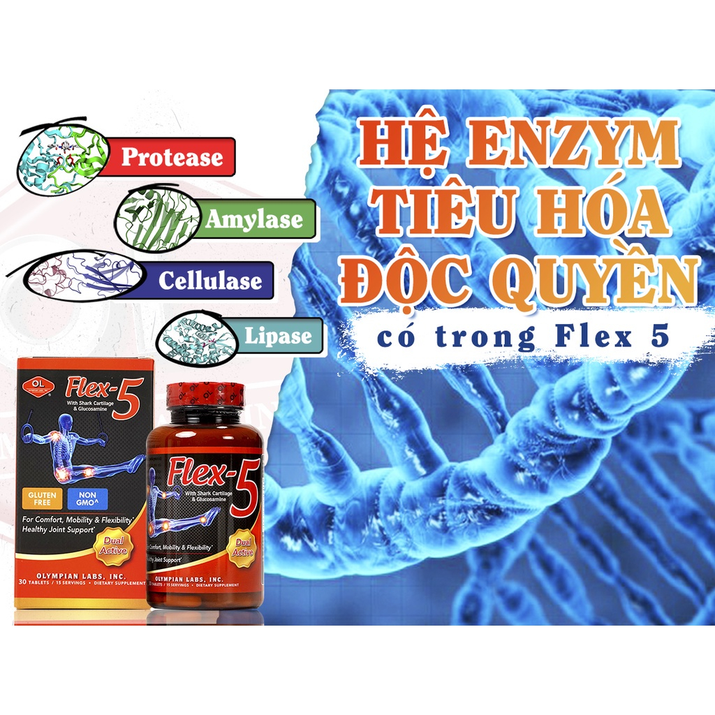 2. Thông tin sản phẩm : Viên uống xương khớp Flex 5 Olympian Labs giảm triệu chứng đau nhức xương hộp 30 viên Việt Mỹ Pharmacy Đau nhức xương khớp luôn là nỗi ám ảnh với người lớn tuổi. Hiểu được điều này, các nhà khoa học Mỹ đã cho ra đời viên uống Flex-5. Viên uống hỗ trợ xương khớp Flex-5 với tỷ lệ tối ưu từ các thành phần chuyên biệt như glucosamine, sụn cá mập, cây vuốt mèo... giúp cải thiện hiệu quả chứng khô, đau khớp, tăng khả năng hấp thu các dưỡng chất giúp tái tạo sụn khớp khỏe mạnh.
