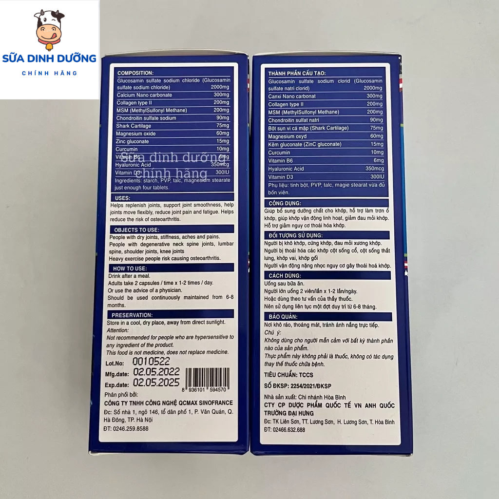 👉 Hiệu quả trong việc giảm đau, sưng viêm khớp - một triệu chứng thường gặp của người viêm khớp dạng thấp. 👉 Khả năng tuyệt vời của GLUCOSAMIN trong việc đẩy nhanh quá trình phát triển của sụn khớp, góp phần giúp khớp xương tổn thương mau chóng phục hồi. 👉 Cải thiện tình trạng đau nhức ở đầu gối hoặc cột sống Công dụng Glucosamin 2000mg 👌 Tăng cường khả năng tái tạo các mô sụn, đồng thời ngăn ngừa, ức chế các men phá hủy sụn 👌 Cải thiện khả năng hấp thụ canxi, giúp xương khớp chắc khỏe hơn, chống loãng xương, ngăn ngừa tình trạng thoái hóa khớp 👌 Duy trì sử dụng Glucosamin giúp bổ sung chất nhầy cho các khớp xương, tăng sự linh hoạt cho các khớp xương, giúp quá trình vận động dễ dàng hơn 👌 Tác dụng giảm đau, giảm sự tấn công của các cơn đau khớp Đối tượng sử dụng Glucosamin 2000mg 👌 Thích hợp cho những người bị loãng xương, thoái hóa xương khớp, viêm khớp 👌 Dùng cho các trường hợp hư xương khớp: hư đốt sống cổ, hư khớp háng, viêm khớp bán cấp, viêm khớp mãn tính 👌 Hữu hiệu cho những người làm việc nặng, thường xuyên vận động tay chân, người bị chấn thương do chơi thể thao liên quan đến gân, sụn, dây chằng, xương. Cách dùng: Uống sau bữa ăn Người lớn uống 2 viên /lần* 1-2 lần/ngày Nên sử dụng liên tục một đợt duy trì từ 6-8 tháng Đảm bảo quá trình hiệu quả, chức năng sụn khớp nhanh chóng phục hồi ❌ Cam kết hàng chính hãng 100%. Phát hiện không chính hãng hoàn tiền 200% cho mọi người yên tâm ❌ Lưu ý: Sản phẩm này không phải là thuốc và không có tác dụng thay thế thuốc chữa bệnh. Không dùng cho phụ nữ có thai và đang cho con bú.