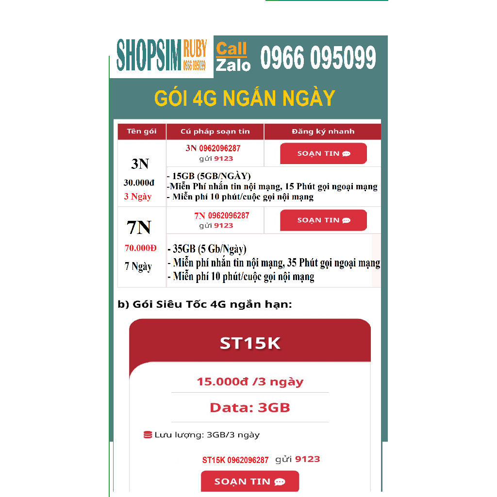 A. Sim Shop giao tất cả là Sim Viettel Chính hảng,Trả trước , Tài khoản sau khi mua là 0đ với tiện ích như sau: - Sim Gói cước Tomato,Nghe gọi mãi mãi không cầnphải nạp tiền hàng tháng, Khách lưu ý là Trong vòng 60 ngày Quý Khách có gọi dùm Shop 01 cuộc gọi đi bất kỳ thì hạn sử dụng sẽ tăng liên tục. - Sim Viettel trả trướcdùng để nghe gọi 02 chiều, Khách sử dụng bao nhiêu thì nạp tiền bấy nhiêu. B.- Ngoài ra Khách hàng có nhu cầu sử dụng 4G, gọi nhiều thì đăng ký sửdụng thêm các gói cước hấp dẫn phù hợp với nhu cầu của Khách, Shop mô tả và giới thiệu những gói cước áp dụng cho những sim Shop Bán. - Sử dụng ngắn hạng vài ngày. + Chỉ cần 4G thì có gói ST15 (15.000đ/3 ngày, có ngay 3Gb lưu lượng tốc độ cao sử dụng trong 03 ngày). +Nhắn tin nội mạng viettel thì có gói S5 (5.000đ/7 ngày, miễn phí 500 tin nhắn nội mạng). + Gọi Nội mạng viettel thì có gói MP5X (5.000đ/ngày, có 50 phút gọi nội mạng sử dụng đến 24h hàng ngày). - Chỉ có nhu cầu gọi nội mạng tính theo tháng, có gói MP30X (30.000đ/tháng, miễn phí 10 phút/cuộc gọi nội mạng, sử dụng tối đa miễn phí 500 phút/tháng). - Chỉ có nhu cầu sử dụng 4G tính theo tháng, có gói SD70 (70.000đ/30 ngày, miễn phí 1Gb/ngày, tháng có 30Gb). - Có nhu cầu sử dụng Gọi nội mạng, ngoại mạng và 4G có gói V90B (Miễn phí 10 Phút/Các cuộc gọi nội mạng-Miễn phí 30 phút gọi ngoại mạng/Tháng - Miễn phí 1GB/Ngày dùng toàn quốc – Phí đăng ký tháng đầu: 90.000đ/Tháng, Qua tháng sau hệ thống tự động gia hạn. • Sim Viettel Shop bán cho Khách có hơn 100 gói cước cho Khách hàng tham khảo, để biết nhiều gói cước khác thì Khách làm như sau: Sau khi khách đăng ký chính chủ và kích hoạt sử dụng, Khách tải My Viettel về máy điện thoại, Khách đăng nhập số điện thoại mới mua vào My Viettel, thì khách sẽ thấy sim Khách mua có rất nhiều gói cước được mô tả trong My Viettel, Khách thấy nhu cầu mình sử dụng phù hợp với gói nào thì Khách sẽ đăng ký gói đó. HỖTRỢ / HƯỚNG DẪN -Sim4G có hỗ trợ cả máy 3G- Bảo Hành 12 tháng trên hệ thống toàn quốc - Sim 3 in 1Thích hợp với các dòngđiện thoại, Ipad , Thiết bị phát Wifi, Dcom (Sim thường,Mirco, nano)....