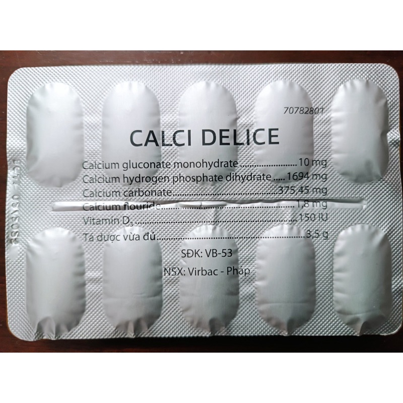 Calcium gluconate monohydrate.................................10 mg Calcium hydrogen phosphate dihydrate..................1694 mg Calcium carbonate..............................................375,45 mg Calcium flouride........................................................1,8 mg Vitamin D3 .................................................................150 IU Tá dược vừa đủ............................................................3,5 g