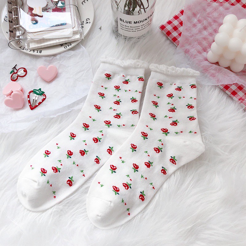Giới thiệu Vớ cotton mềm cổ cao đến mắt cá chân in hình hoa/ đầu lâu dễ thương cho nữ