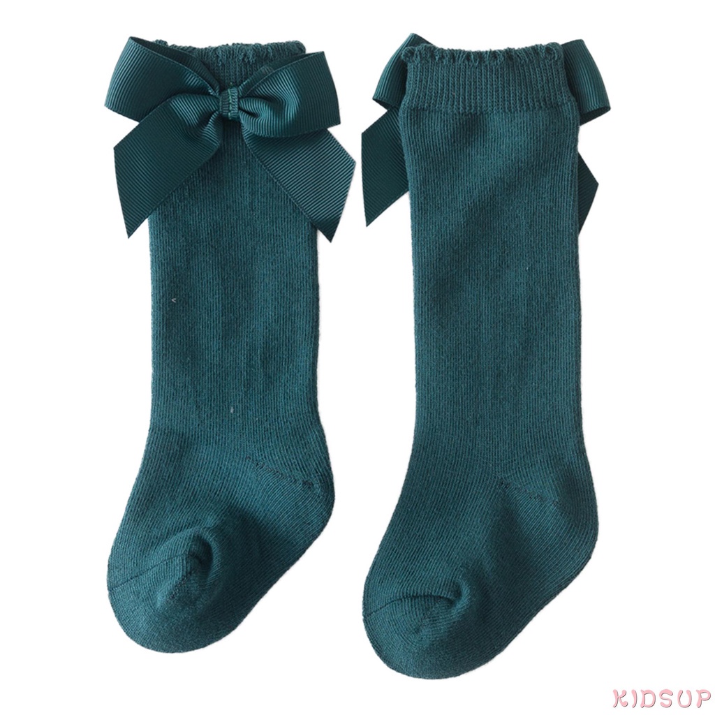 Vớ dài cho bé gái trên đầu gối, hoạt hình dễ thương phối nơ màu trơn, có rãnh thoát khí ấm áp cao đầu gối